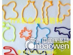 本公司专业生产TPR/SBS/TPE弹性体材料可用于注塑或挤出加工成型,做橡皮筋用。材料为白色,半透明或透明颗粒,容易配色。硬度Shore 30~50A,材料特性,较强的拉伸度及断裂伸长率,材料无毒无味,符合ROHS,REACH,EN71环保检测标准。用TPR/SBS/TPE原材料做橡皮筋,与传统的橡胶及硅胶材料相比,更容易生产加工成型。此类橡皮筋价格便宜,拉伸强度高,比重轻,易调色等。